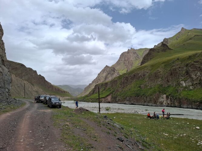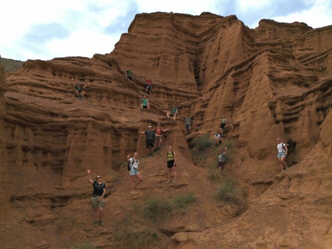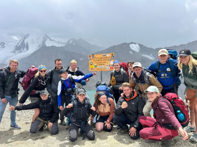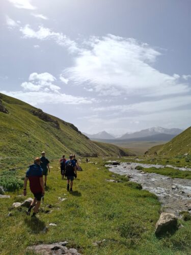 We reizen rond in robuuste terreinwagens zodat we overal kunnen komen. En er staat een meerdaagse trektocht op het programma in Jyrgalan, een gebied waar weinig toeristen komen en dat erg geschikt is voor zo’n tocht. Met onze backpacks gaan we de bergen in. We filteren water uit de rivieren en koken onze eigen maaltijden op een vuur. Dit is geen zondagmiddagwandelingetje, maar een intensieve tocht: uren per dag met bepakking op grote hoogte lopen. Het is zwaar, het is afzien en het is een fantastisch mooie ervaring. Na afloop nemen we een duik in het grootste meer van Kirgizië: Yssyk Kul. In het Kirgizisch betekent dit ‘warm meer’, dus heerlijk om in te zwemmen!