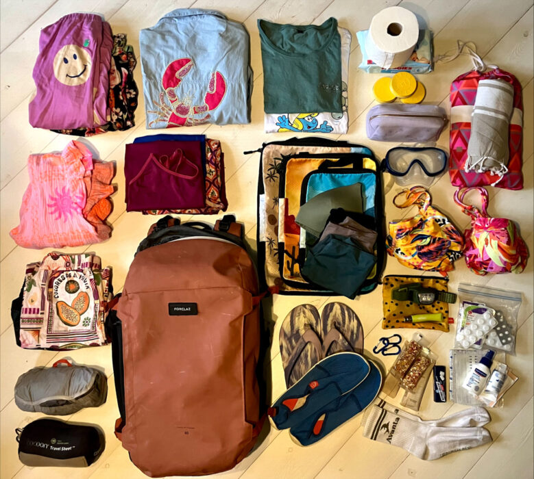Ik probeer altijd combinatie setjes te maken, zodat ik zo’n 3 setjes kleding mee heb, 2 paar ondergoed en een dunne sneldrogende handdoek. Voor de avonden die koel kunnen zijn of tegen de muggen heb ik kleding bij me wat ik vaak al aantrek op de heenreis, een wijde broek, trui/ blouse met shirt zodat je bij aankomst ook snel wat laagjes uit kunt trekken.